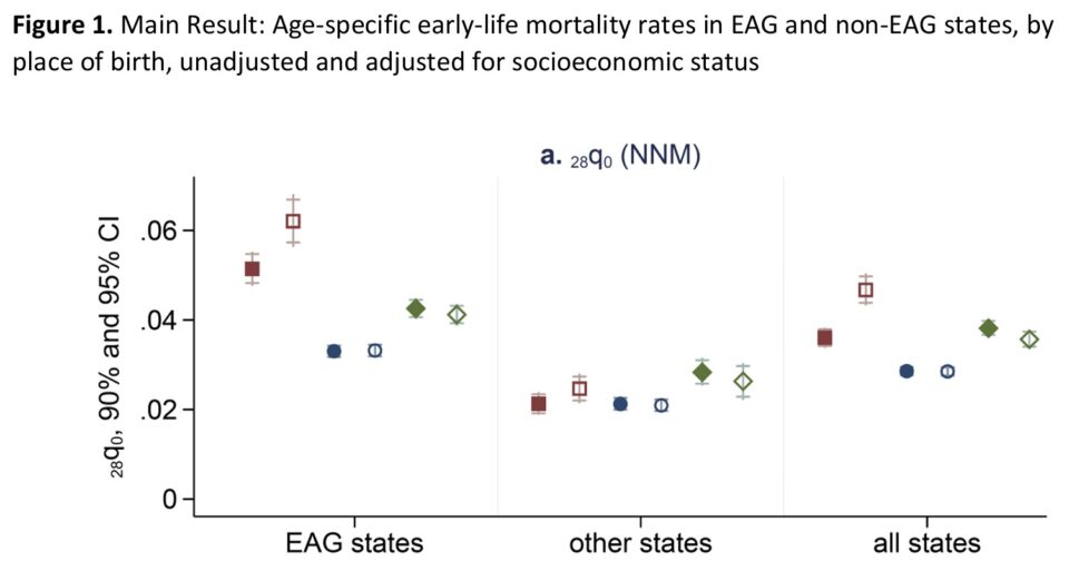 Almost one-fourth of neonatal deaths occur in India, many of them in the Empowered Action Group (EAG) states. Research has compared facility births with home births, with limited investigation of mortality differences between births at public and private facilities. We ask how early-life mortality in the rural population of the EAG states and the rest of India differs according to the setting of birth. We consider whether quality of care can help explain the differences we find. Using rural births in India’s 2019-21 Demographic and Health Survey, we find that in the rural population of EAG states, neonatal mortality among private facility births is 44 per 1000 (95 % CI: 40–48), compared with 29 per 1000 in public facilities (95 % CI: 27–30) and 38 per 1000 for home births (95 % CI: 34–41). Standardization by socioeconomic status increases the public-private gap. These differences persist even stratifying on key predictors of neonatal mortality. The excess mortality among births to the rural population in private facilities, compared with public facilities, accounts for about 43,000 excess neonatal deaths annually in EAG states. Evidence suggests that low-quality care is among the important causes. Most births in India now occur in facilities. Many happen in private facilities run by providers who lack training, resources, and legal permission. The quality of private health facilities serving the rural EAG population appears to be particularly poor.